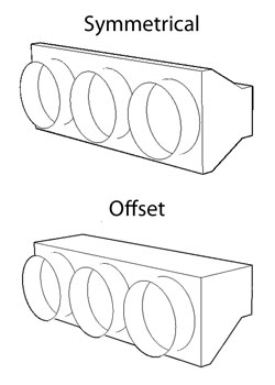 Tapered 3 spigot plenum boxes are available with or without a flange at the open end (see drop down for options). By default spigots are configured in an equally spaced linear fashion as illustrated in the drawings. They can be provided in a symmetrical or offset design (see images).